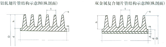 鋁軋翅片管結(jié)構(gòu)示意圖(縱剖面) D翅片管外徑 δ翅片管壁厚 t翅片片距離 s翅片厚度 h翅片高度 |